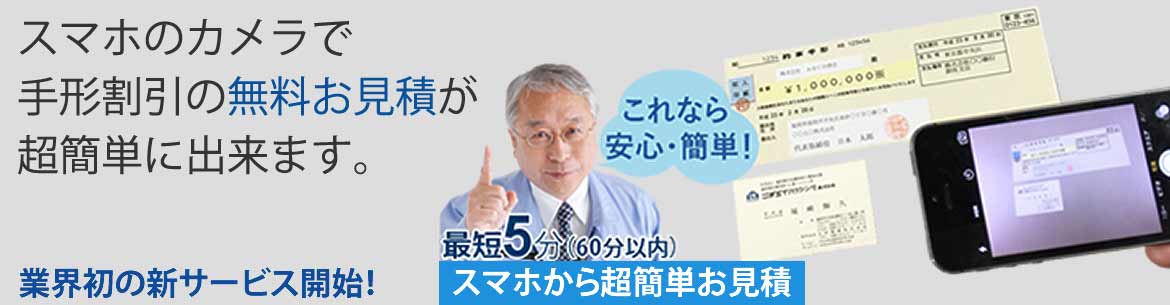 お客様のお手元にスマートフォンがあれば、手形とお客様の名刺の写真を撮るだけで手形割引の無料お見積が簡単に出来ます。この手形割引無料お見積サービスは、日栄倉庫株式会社が 2013年4月に、業界初のシステムとして開発したものです。他社の類似するサービスに比べより簡単かつ安全(セキュリティ)にお見積が出来ます。