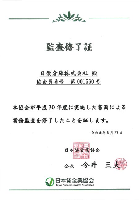 日本貸金業協会が実施する3年に1度の書類による業務監査が無事修了いたしました。